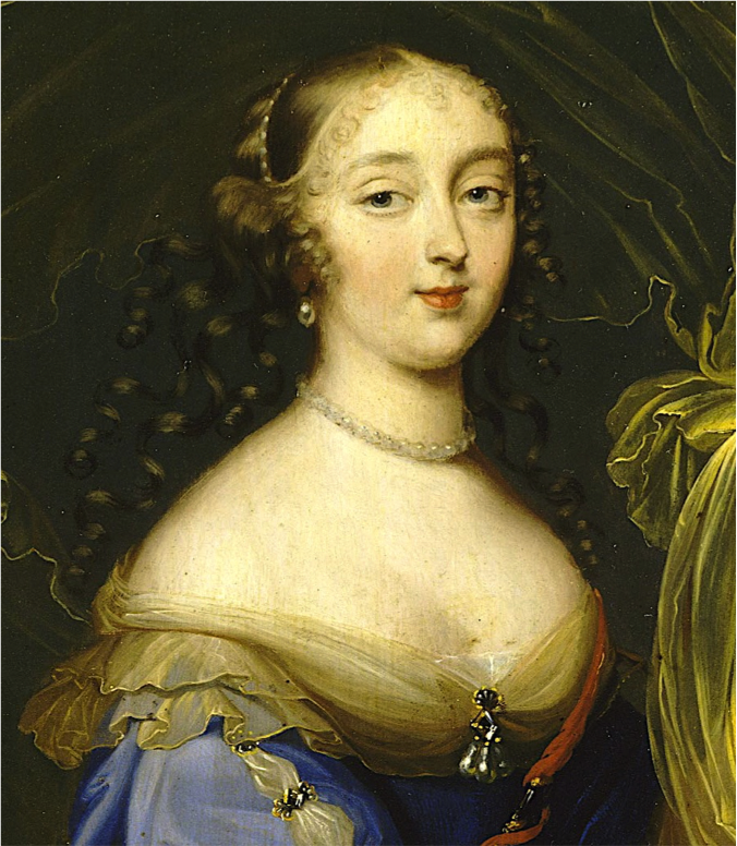 Née en 1639, elle fut le premier amour de Lois XIV. Nièce de Mazarin, Marie Mancini arriva en France pendant son adolescence et vécut plusieurs années à la Cour avec le futur Louis XIV. En 1658, Louis et Marie avaient l’intention de se marier mais la reine mère Anne d’Autriche et le cardinal Mazarin s’opposèrent à cette union pour mésalliance. Ils négocièrent tous deux le futur mariage avec la princesse Marie-thérèse d’Autriche. Louis XIV, le cœur brisé, accompli son rôle de roi et rompt avec sa bien-aimée qui fut éloignée de la Cour. Ils ne se revirent plus jamais. Cette rupture eut pour influence, que Louis XIV ne laissa jamais ses affaires privées prendre le dessus sur son rôle de roi. Plus tard, Marie fut mariée à un prince Onuphre Lorenzo Colona, qui après quelques années de bonheur conjugal, la trompa. Marie prit la fuite pour la France puis sur ordre de son époux, fut envoyée dans un couvent. Des années plus tard, elle écrit à Louis XIV pour le revoir revoir mais celui-ci refusa. Marie retourna en Italie y retrouver ses enfants. Elle y mourut en 1715.