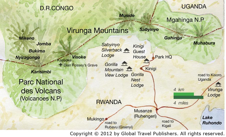Le 9 juillet 1967, Dian est attendue par un comité d’accueil, après sa journée avec les gorilles, composé de soldats et de porteurs afin d’escorter Dian hors des montagnes sur les recommandations de Anicet Mburanumwe (directeur du parc) car des rebelles font rage et un racisme anti-blanc sévit. Tant bien que mal, Dian s’y résout et pendant plusieurs semaines, elle perd le contact avec ses gorilles. Après quelques mésaventures, Dian se retrouve au Rwanda, au sud de l’équateur. Le Rwanda est recouvert d’une végétation spectaculaire. Deux parcs nationaux en font partie : A’kagera au nord-est et le parc des Volcans au sommet des montagnes du Virunga au nord-ouest.