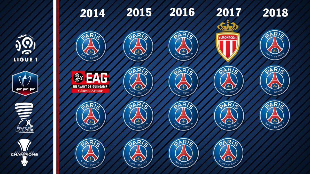 Depuis le rachat, le rythme s’est accéléré. Revenu sur le devant de la scène au niveau national, Paris ne laisse filer que deux championnats : celui de 2012-13 au profit du Montpellier HSC du regretté Louis Nicollin, et celui de 2016-17, tombé dans l’escarcelle de l’AS Monaco. Soit, tout de même, 5 titres nationaux en sept ans, dont 3 à plus de 90 points. Cette année, les joueurs de la capitale ont été sacrés au soir de la 33e journée (en infligeant un terrible 7-1 à Monaco, tenant du titre).