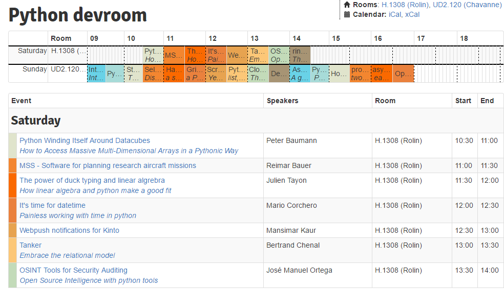 Les conférences se passent le samedi et le dimanche. Toutes les technologies se trouvent réparties dans les divers salles et amphithéâtres disponibles au sein de l’ULB. Selon le nombre d’intervenants et la popularité de la technologie, la salle allouée était plus ou moins grande (d’une trentaine de places pour les conférences Big Data par exemple, à quelques 1500 places sur le Janson, amphi principal de l’université), et une journée suffisait pour faire le tour, excepté Python qui s’est retrouvé présent les deux jours, comme le montre un extrait du calendrier de cette année :