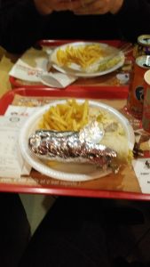 - Un peu de frites au milieu d’une baguette de pain, de viande, et de sauce samouraï. Le vendredi midi,