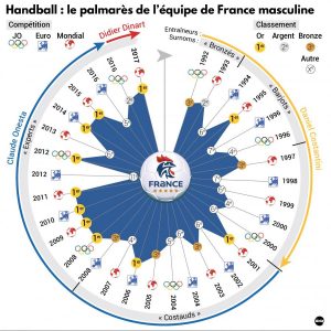 Mais la vraie période de domination se situe après 2008 avec “les Experts”, sous la houlette de Claude Onesta, qui gagnent deux Olympiades de suite (Pékin 2008 / Londres 2012), deux titres européens (Autriche 2010 / Danemark 2014) et trois titres mondiaux (Croatie 2009 / Suède 2011 / Qatar 2015) avant la compétition qui s’est donc tenue du 11 au 29 Janvier dernier, remportée de main de maître devant la Norvège qui disputait sa première finale mondiale masculine !