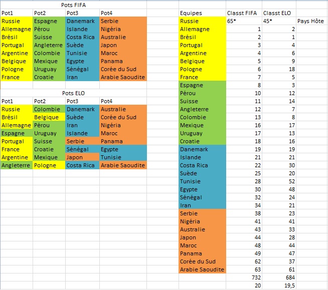 Avec le classement ELO, l’Espagne et l’Angleterre monteraient pot 1, laissant leurs places à la Belgique et à la Pologne en pot 2. La Serbie et le Japon ferait de même sur le pot 3, interchangeant avec l’Egypte et la Tunisie. Cela confirme globalement une logique commune. Si seul 12,5% des équipes changent de pot, c’est que les méthodes sont assez homogènes, même si on note de bons écarts de classements dans certains cas (25 pour la Corée du Sud, 24 pour la Tunisie, 18 pour l’Egypte).